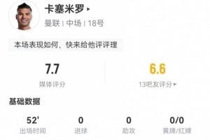 体育资讯3月3日讯 曼联在本轮足总杯被富勒姆点球淘汰,卡塞米罗本场数据如下: