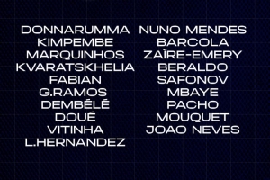 前锋:克瓦拉茨赫利亚、贡萨洛-拉莫斯、登贝莱、杜埃、姆巴耶、巴尔科拉