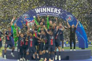 体育资讯06月01日讯 欧冠决赛,巴黎横扫国米夺冠,赛后颁奖仪式进行。