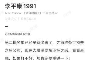 媒体人李平康透露,足坛扫黑第二批名单早就出来了,之前准备世预赛之后公布,现在大概率要东亚杯之后,看看表现,如果打不好,那肯定要重锤一下!
