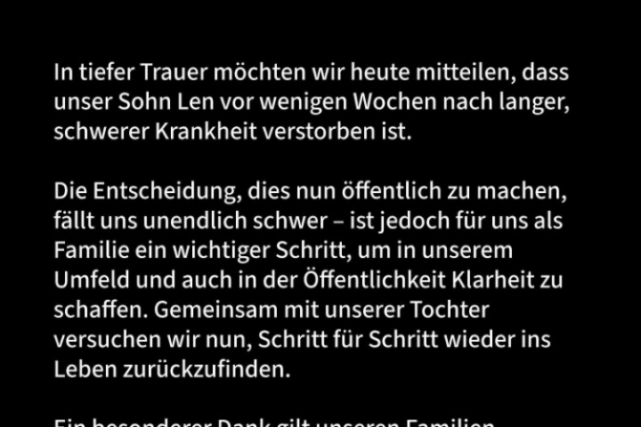 今天,我们怀着沉痛的心情宣布,我们的儿子伦因长期患重病于几周前去世。