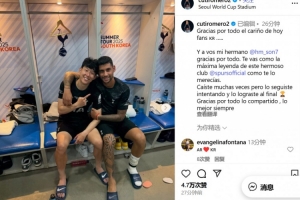 罗梅罗晒出了两人的合照,配文写道:“感谢今天所有的爱,韩国球迷们……”