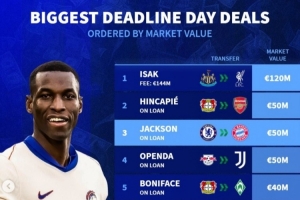 截止日转会身价榜:伊萨克领跑,因卡皮耶&杰克逊&奥蓬达并列次席
