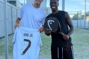 合照中科埃略获赠维尼修斯的签名球衣,而维尼修斯则是手持笼式网球球拍。
