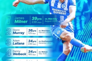 米尔纳在对阵曼城的比赛中破门,以39岁239天成为布莱顿英超最年长进球者。