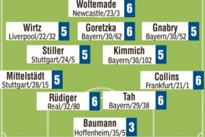 首发:沃尔特马德6分、维尔茨5分、格雷茨卡6分、格纳布里5分、斯蒂勒5分、基米希5分、米特尔施塔特5分、吕迪格6分、若纳坦-塔6分、纳姆迪-科林斯6分、鲍曼3分