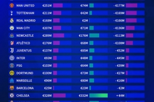 体育资讯9月5日讯 今夏转会市场格外火热,《转会市场》也统计了20支欧洲球队的支出、收入及盈亏情况。