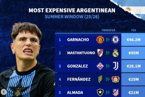 今夏阿根廷球员转会费榜:加纳乔压马斯坦托诺居首,阿尔马达在列