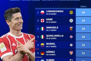 体育资讯9月14日讯 德国转会市场统计了本世纪五大联赛球员对阵老东家的进球数量,并列出榜单,莱万对阵多特打进29球居首,凯恩对阵莱斯特城攻入19球次席。