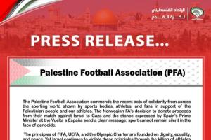 巴勒斯坦足球协会谨向体育机构、运动员和球迷们近期展现的声援行动致以敬意,感谢他们对巴勒斯坦人民及运动员的支持。挪威足协决定将对阵以色列队的比赛收入捐赠给加沙地区,西班牙首相在环西班牙自行车赛期间表明的立场,都发出了明确信号:体育界面对种族灭绝罪行绝不能沉默。