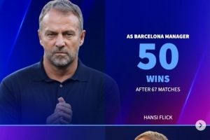 自执教巴萨以来,弗里克已经带队进行了67场比赛,取得50胜8平9负的战绩,接近执教拜仁63场50胜的数据。
