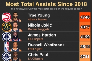 体育资讯9月27日讯 美媒HoopsHype统计,从2018年至今NBA助攻最多的10位球员,其中特雷-杨最多有4748次,而约基奇排名第二有4377次。