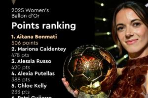 28分优势!女足金球奖得分:邦马蒂506分 卡尔登泰478分 鲁索420