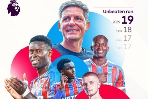 据英超官方统计,水晶宫各赛事19场不败,创造队史最长不败纪录。