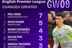 体育资讯10月28日讯 英超第9轮战罢,据Squawka数据统计,福登是本轮创造机会次数最多的球员,共计7次。