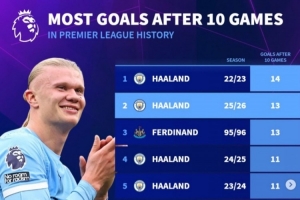 体育资讯11月3日讯 本赛季英超10轮过后,曼城前锋哈兰德已经打进了13球,据德转统计,在联赛历史各赛季前10轮进球榜中,这一进球数排在第二位。