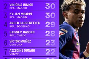 本赛季西甲过人榜:亚马尔33次第1,维尼修斯和姆巴佩30次并列第2