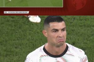 体育资讯11月14日讯 葡萄牙vs爱尔兰,C罗下半场因肘击动作被罚下。